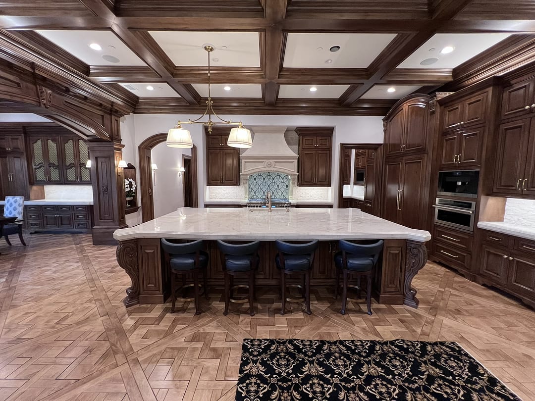 Columns, arched openings, paneled rooms and beamed ceilings designed to read as one continuous language throughout the home.