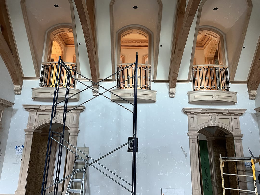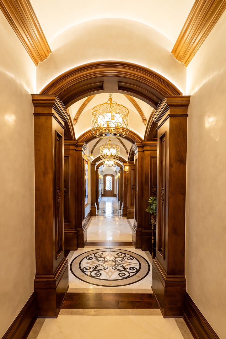 Long galleries, paneled arches, and built-ins connect this home from room to room. Our Millwork Design Team guided the project from early sketch concepts through detailed CAD, takeoffs, and on-site coordination — from bare framing to a fully completed classical interior.