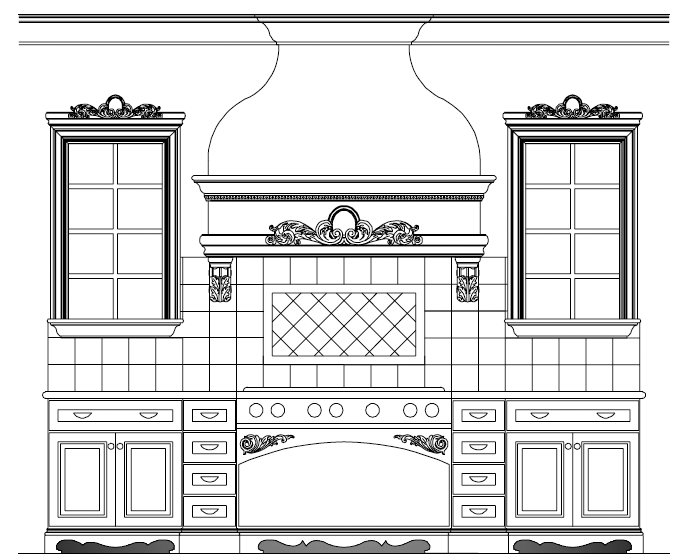 Pediment: PED5669, Rangehood: MLD5867, MLD5890, PED5667, Corbel: CRV5263, Sill: MLD5867 Carved Scroll: CRV5649, Bottom Panel Mould: MLD6018, Middle Valance Board: VAL6402, Side Valance Board: VAL6404