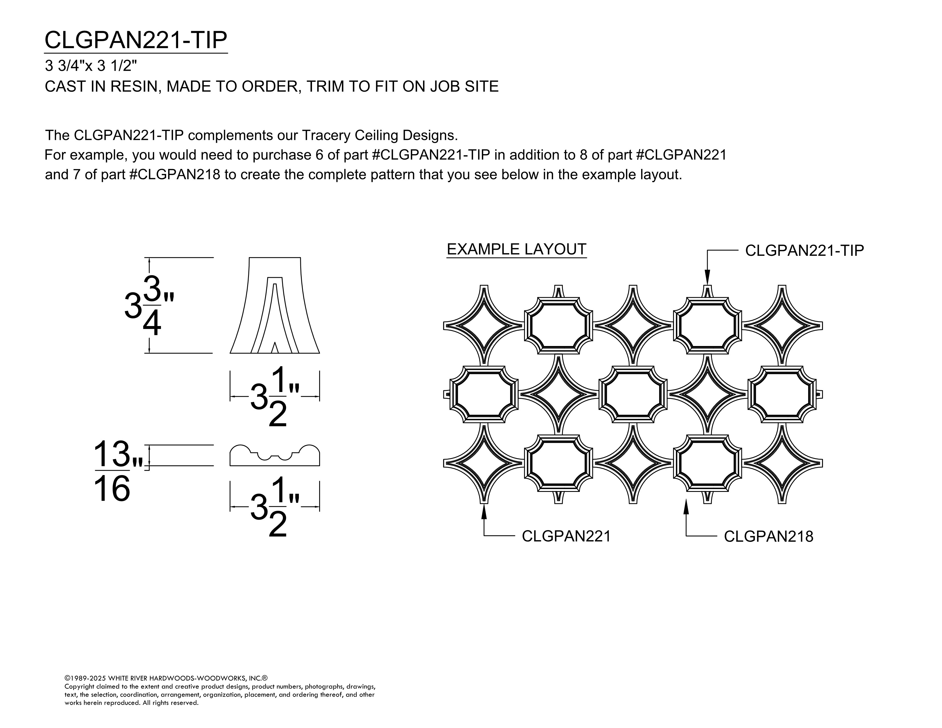The CLGPAN221-TIP is designed to pair perfectly with our CLGPAN221 and CLGPAN218 panels (as shown in the example layout). Crafted in durable resin, these components capture fine architectural detail, are lightweight, and ready to paint, gild, or finish to match any ceiling style.